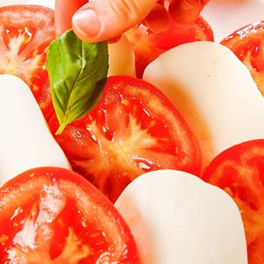 - Enjoy a stylish Italian salad, featuring sliced fresh mozzarella, ripe tomatoes, and fragrant sweet basil, all seasoned with salt and drizzled with olive oil.