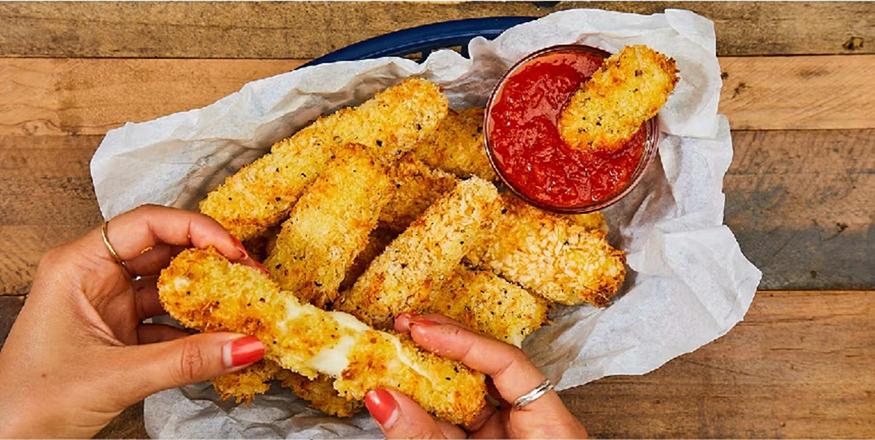 - Step 4Arrange frozen breaded mozzarella sticks in an even layer in the basket of your air fryer. Cook on 400° for 6 minutes, or until golden and crisp on the outside and melty in the center.