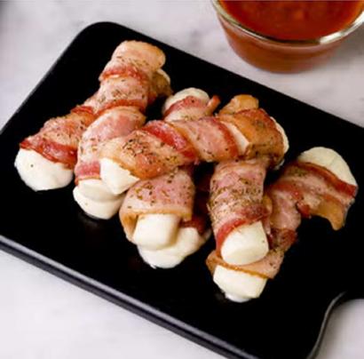 - Step 4Wrap each frozen stick of string cheese with 1 strip bacon. Place on prepared baking sheet and bake until bacon is crisp and string cheese is just starting to melt, 5 to 7 minutes.